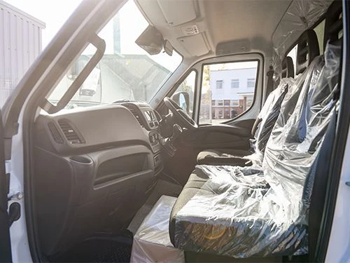 Fabric High Comfort seat (Changed to leather – see below), door roller blinds, auto control air conditioning (Changed to Auto A/C system with parking cooler – see below). Infotainment + Navigation, leather steering wheel and Conb 4G + Cradle predisposition
