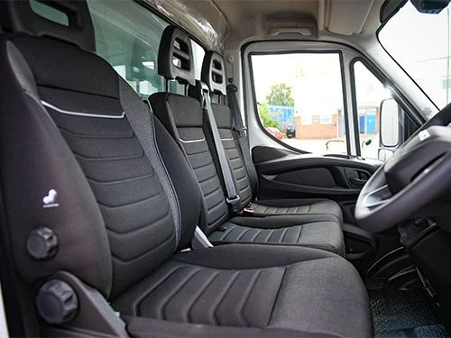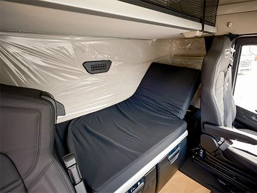 Fabric Air suspended passenger seat (Changed to leather – see below), top bunk with lower reclining, independent cab heater 4Kw, ambience Lighting, premium fridge