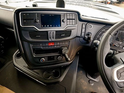 Fabric High Comfort seat (Changed to leather – see below), door roller blinds, auto control air conditioning (Changed to Auto A/C system with parking cooler – see below). Infotainment + Navigation, leather steering wheel and Conb 4G + Cradle predisposition