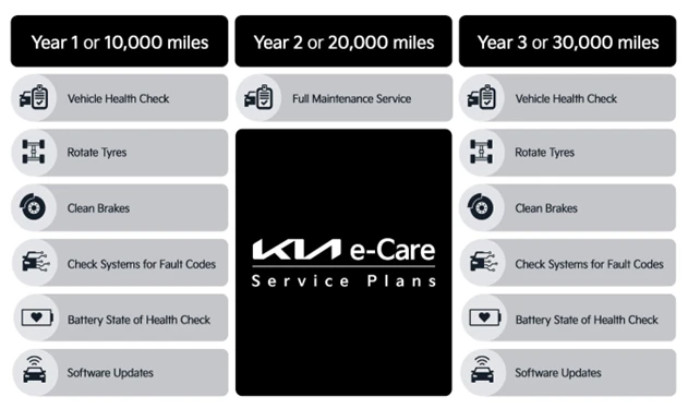 Battery state of health check – Regular monitoring of your EV’s battery ensures peace of mind by providing insights into the battery’s condition. The Kia e-Care plan includes a comprehensive assessment and a detailed report of your battery’s health.