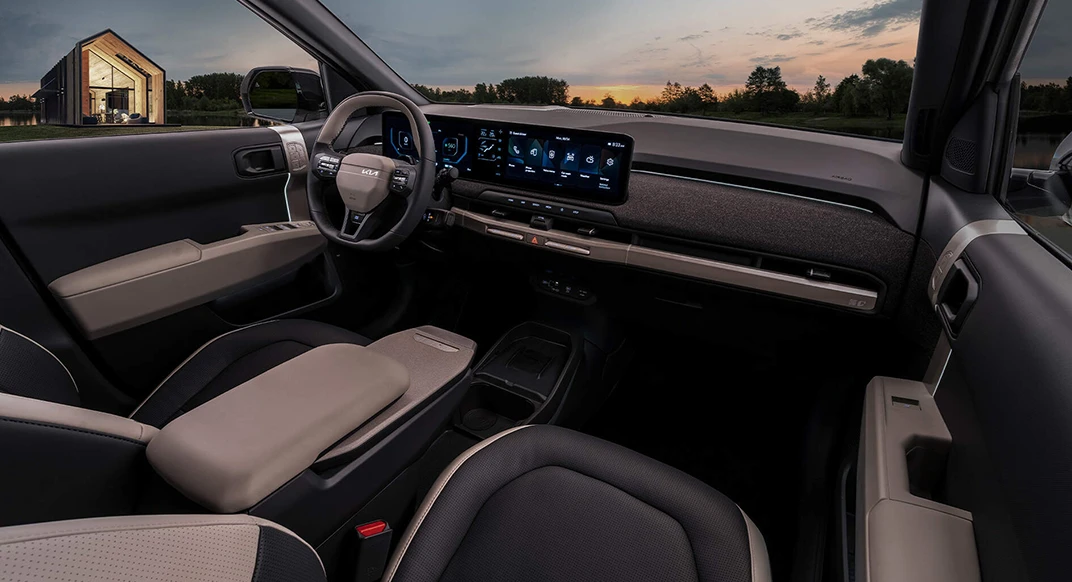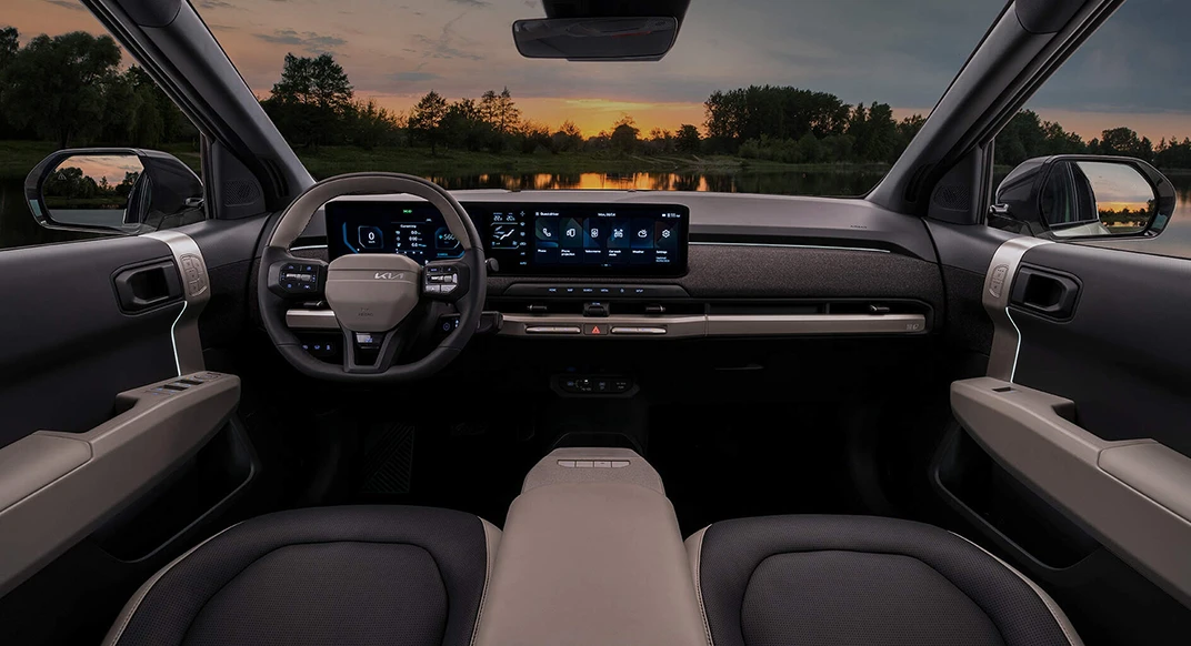 The EV3 comes equipped with a dual 12.3-inch display screens and a five-inch air conditioning panel create a near 30-inch widescreen that seamlessly integrates entertainment and navigation, putting advanced technology at your fingertips.