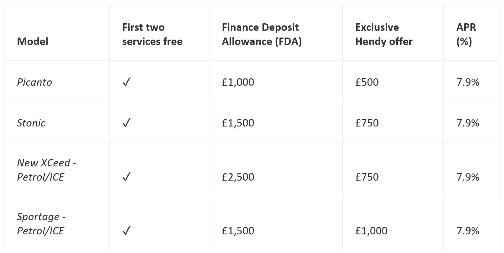 On selected models of the new Kia XCeed, Stonic, Picanto and Sportage, you’ll benefit from 7.9% APR and get the first two services free. What’s more, you’ll get a Finance Deposit Allowance of up to £2,500 – and exclusive to Hendy, you’ll also receive an additional discount off the price of the vehicle.