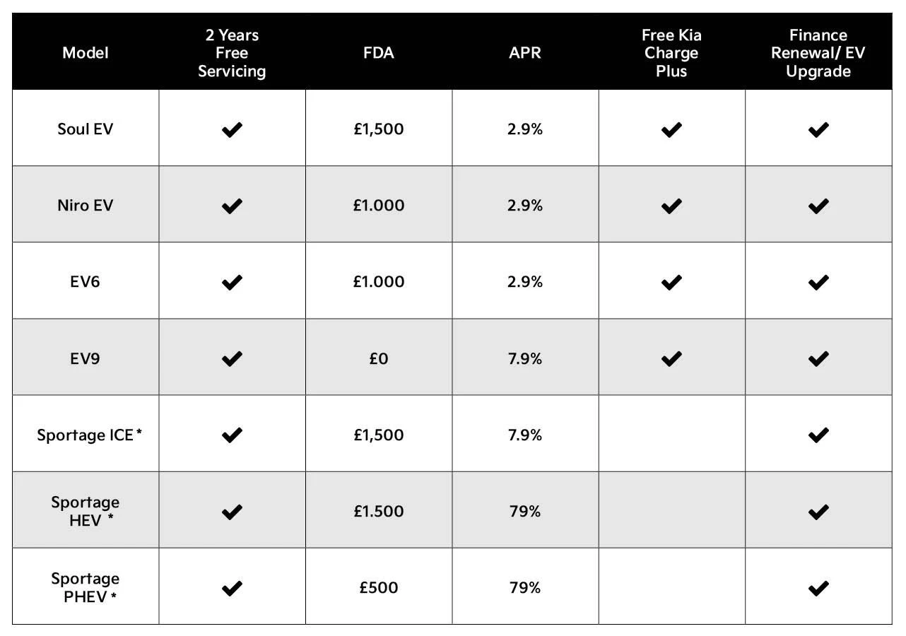 On selected models of the new Kia Soul EV, Niro EV, EV6, you'll benefit from a 2.9% APR. Plus you can benefit from 2 Years Free Servicing, also available on the EV9, Sportage ICE, HEV and PHEV