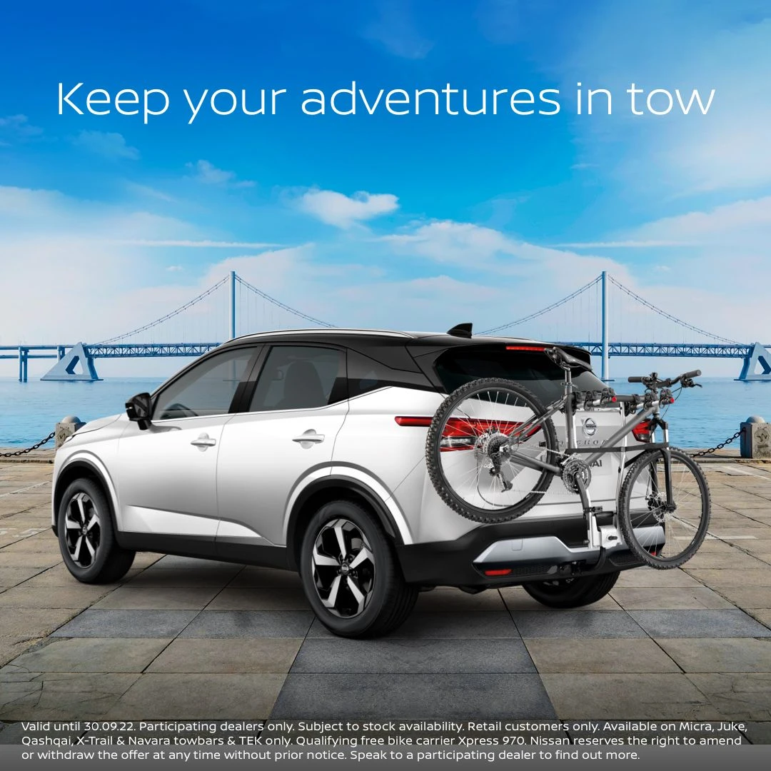 *Valid until 30.09.22. Subject to stock availability. Retail customers only. Available on Micra, Juke, Qashqai, X-trail & Navara towbars & TEK only. Qualifying free bike carrier Xpress 970. Nissan reserves the right to amend or withdraw the offer at any time without prior notice.