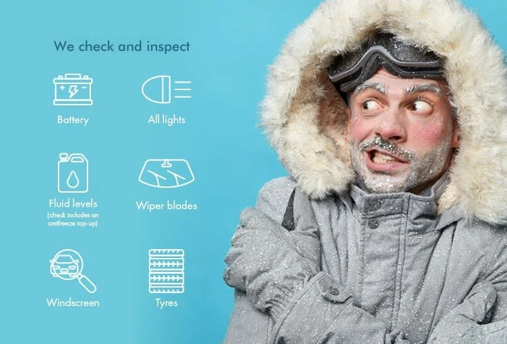 As part of your Winter Health Check we check and inspect: Vehicle battery, lights, fluid levels (check includes antifreeze content test), wiper blades, windscreen and tyres.