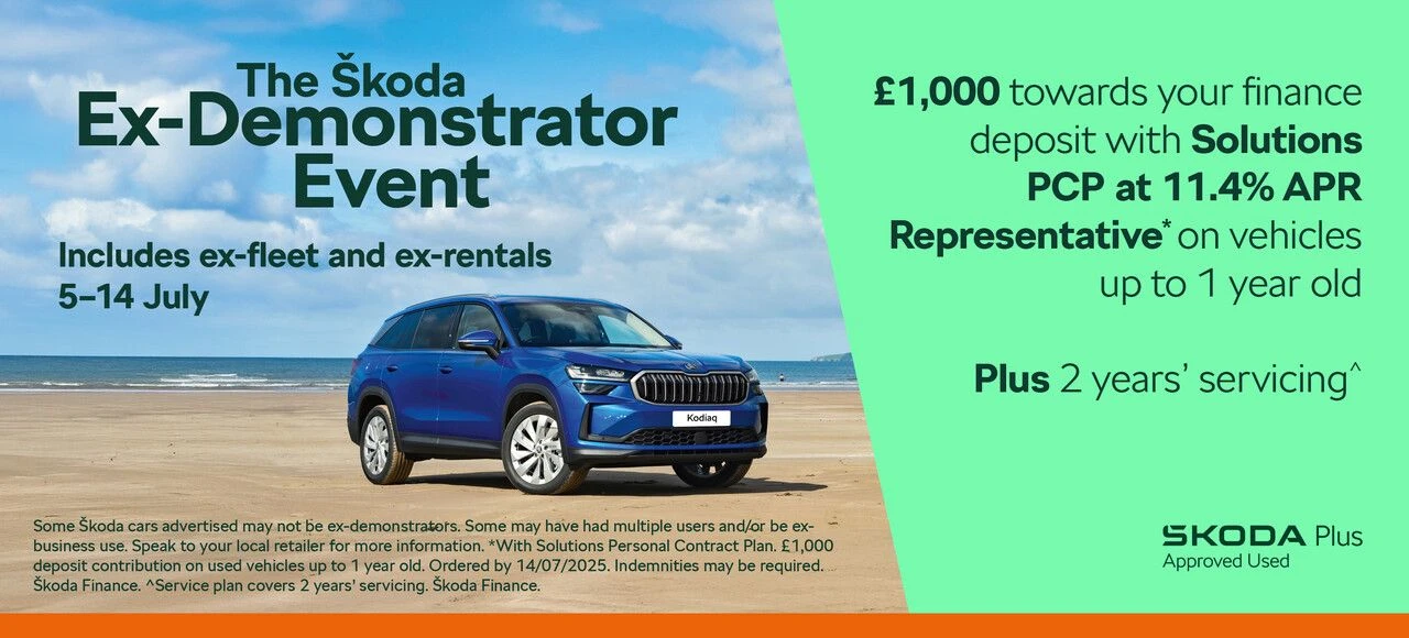Some Škoda cars advertised may not be ex-demonstrators. Some may have had multiple users and/or be ex-business use. Speak to the sales team for more information. *With Solutions Personal Contract Plan. £1000 deposit contribution available on used vehicles up to 1 year old. 18s+. Subject to status and availability. Ordered by 14th July 2025 from participating Retailers. Indemnities may be required. Subject to changes in vehicle or equipment prices. Not available in conjunction with any other finance offer and may be varied or withdrawn at any time. Freepost Škoda Financial Services. Service Plan covers two years' servicing, limited to: 1 x Oil and Inspection Service, 1 x Oil and Inspection Service with Extended Scope, 1 x Pollen Filter for Petrol, Diesel and eHybrid vehicles and 1 x Inspection Service, 1 x Brake Fluid change and 1 x Pollen Filter replacement for battery electric vehicles. Servicing must be carried out at a Škoda Authorised Repairer, in line with the requirements of the service schedule. Additional work, including wear and tear, is excluded. Terms and conditions apply. Administered by Volkswagen Financial Services. Freepost Škoda Financial Services.