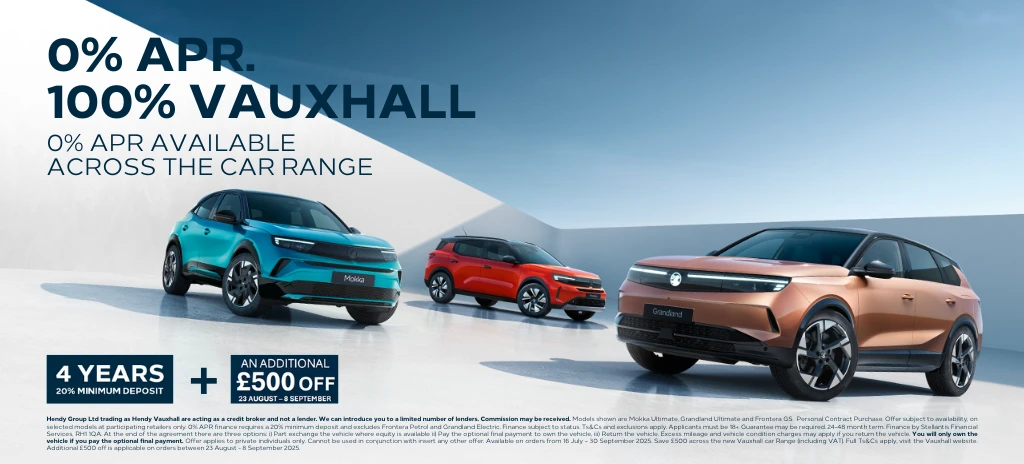 Save £500 across the new Vauxhall car Range (including VAT). Full Ts&Cs apply, visit the Vauxhall website. Additional £500 off is applicable on orders between 23 August - 8 September 2025.