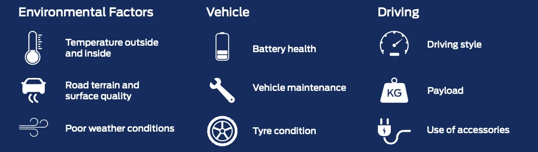 Poor weather conditions. In addition to temperature levels, driving in windy or adverse weather conditions like heavy rain or snow can have a negative impact on range. Driving into a strong headwind will negatively impact range performance.