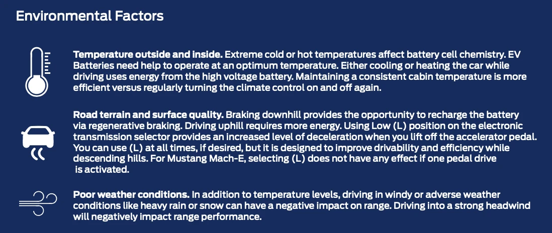 Road terrain and surface quality. Braking downhill provides the opportunity to recharge the battery via regenerative braking. Driving uphill requires more energy. Using Low (L) position on the electronic transmission selector provides an increased level of deceleration when you lift off the accelerator pedal. You can use (L) at all times, if desired, but it is designed to improve drivability and efficiency while descending hills. For Mustang Mach-E, selecting (L) does not have any effect if one pedal drive is activated.